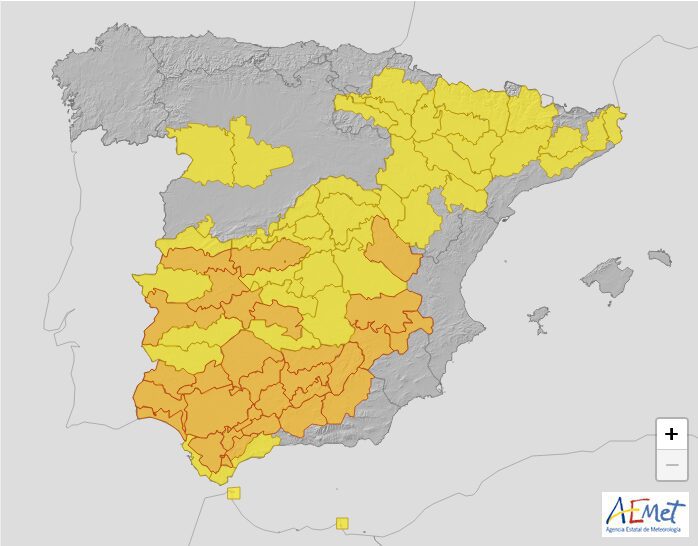 Temperaturas significativamente elevadas en la mitad sur peninsular, así como en el cuadrante nordeste, Baleares y Canarias.