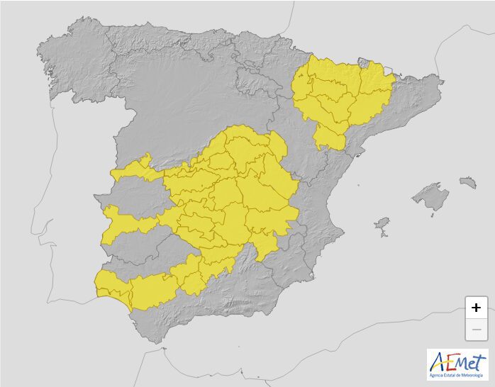 Las temperaturas continuarán en valores superiores a los normales en amplias zonas del país. Las mínimas presentarán descensos en la mitad oeste peninsular y aumentos en el resto del país, con ascensos notable en medianías de Canarias.