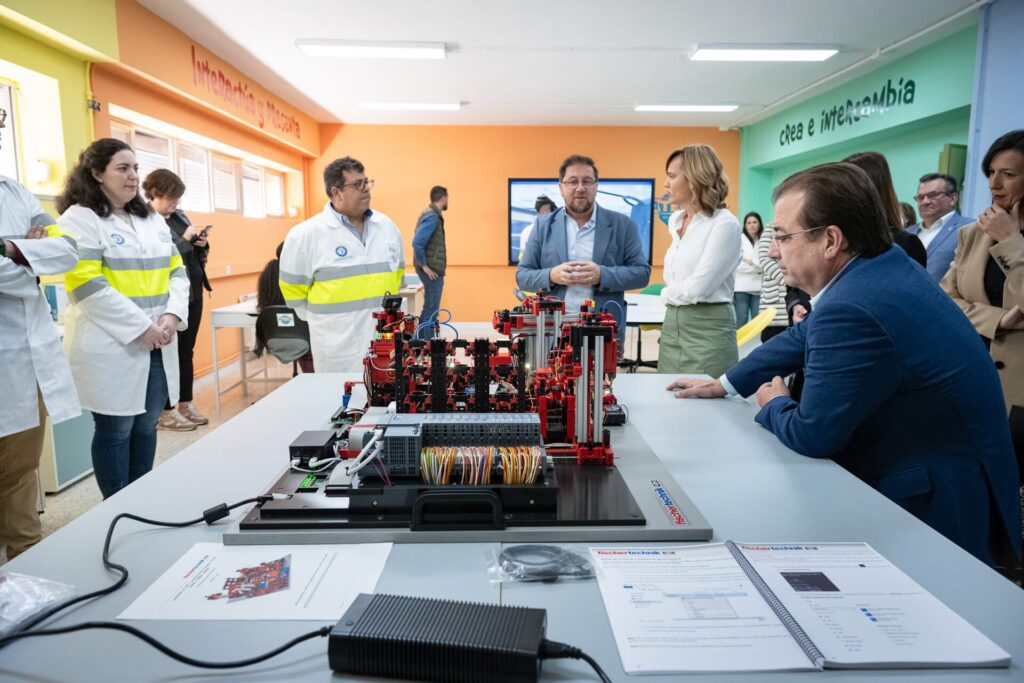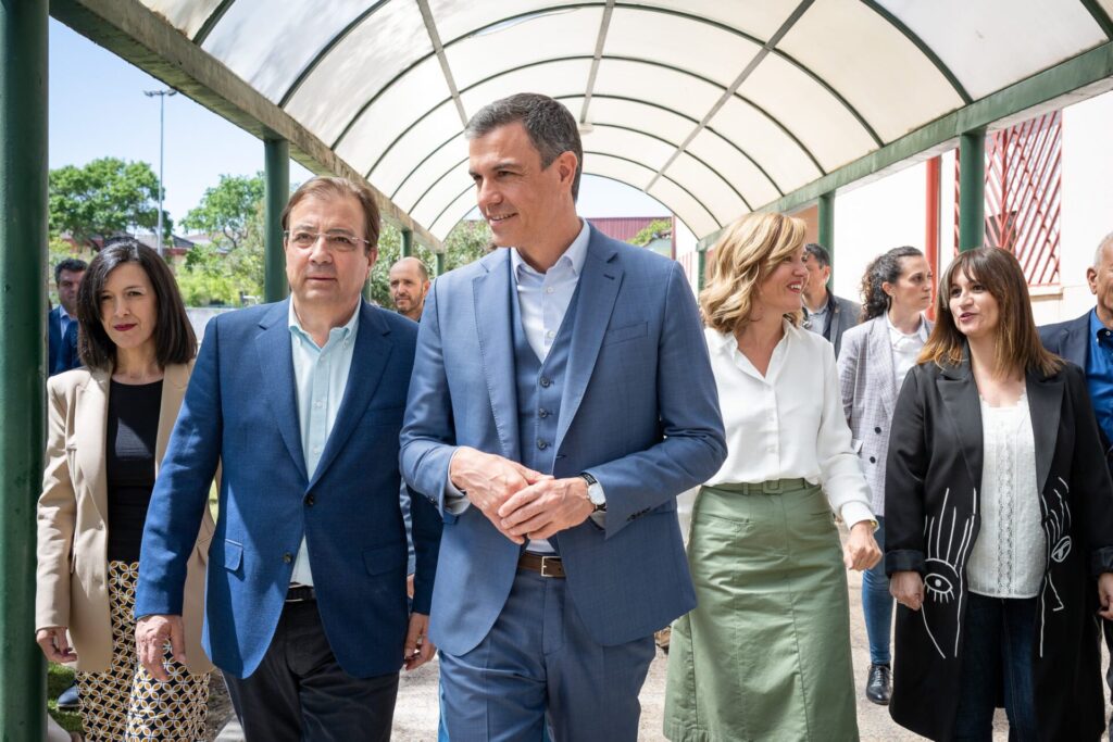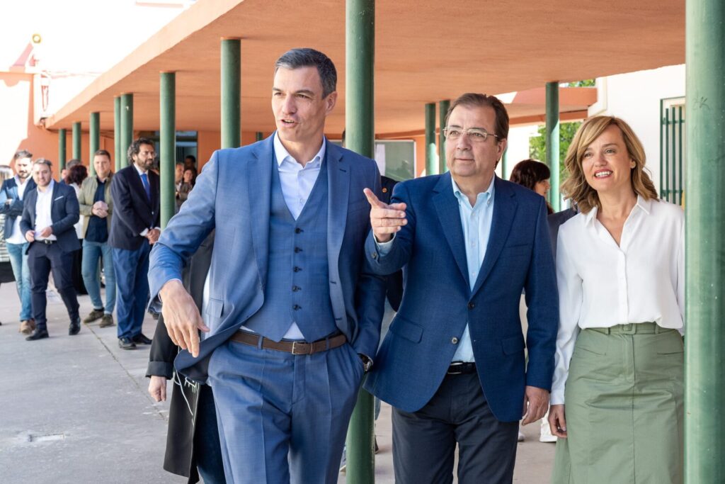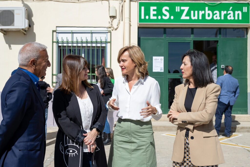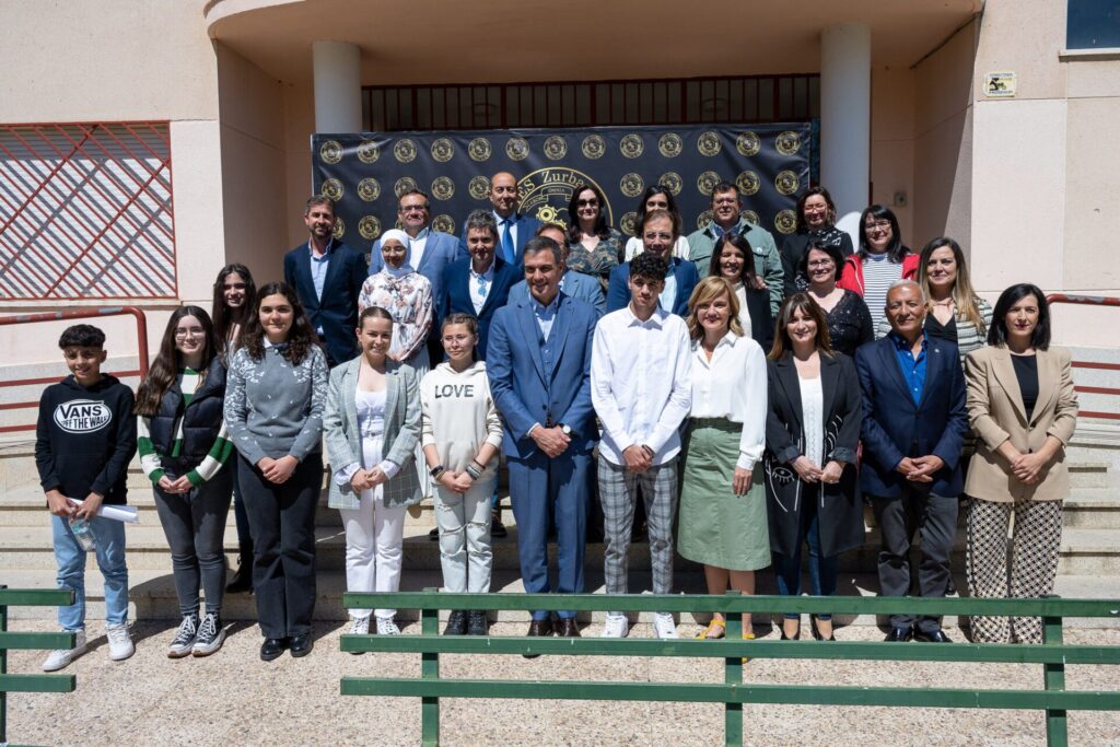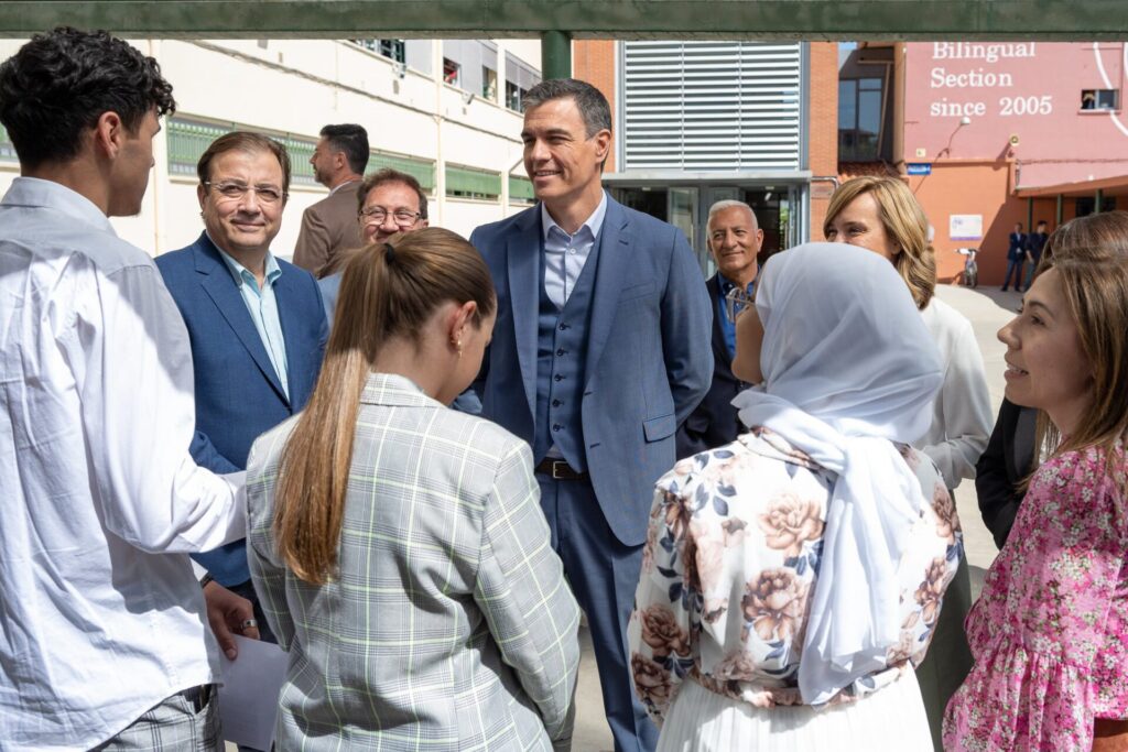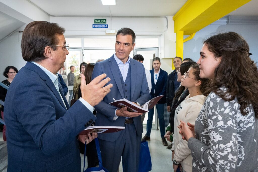 El presidente de la Junta de Extremadura, Guillermo Fernández Vara, junto al presidente del Gobierno de España, Pedro Sánchez, y la ministra de Educación y Formación Profesional, Pilar Alegría, ha visitado este jueves el Instituto de Enseñanza Secundaria Zurbarán, de Navalmoral de la Mata.