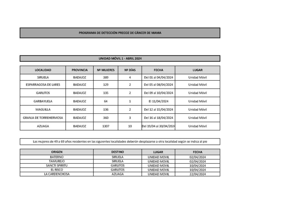 También están citadas las usuarias de otras catorce pequeñas poblaciones, que deberán desplazarse a alguna de las localidades mencionadas anteriormente para realizarse las mamografías en las unidades móviles. Es el caso de las mujeres de Baterno, Tamurejo, Carbajo, Herrera de Alcántara, Mata de Alcántara, Pedras Albas, Villa del Rey, Estorninos, Pantano de Gabriel y Galán, Sancti Spiritu, El Risco, Marchagaz, Robledillo de la Vera y La Cardenchosa.