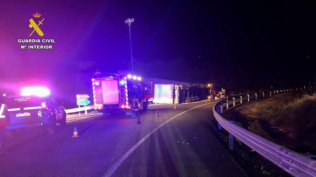 20:15 horas ocurrencia de siniestro vial vehículo articulado volcado en calzada en la Rotonda de Fuentidueñas EXA1/ A66 Plasencia, salida norte.