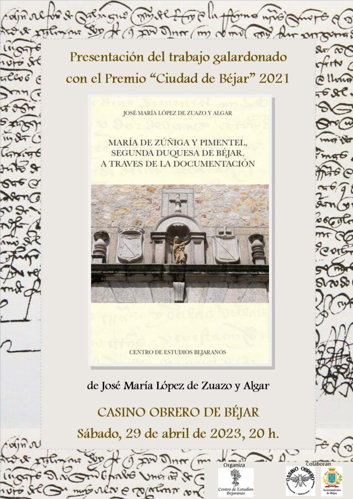 María de Zúñiga y Pimentel, segunda duquesa de Béjar, a través de la documentación, del investigador José María López de Zuazo y Algar, fue uno de los trabajos galardonados el año pasado con el Premio “Ciudad de Béjar” 2021. El próximo sábado 29 de abril de 2023 el Centro de Estudios Bejaranos se complace en presentar el libro resultante en el Casino Obrero de Béjar a las 20h. La entrada será libre hasta completar el aforo.